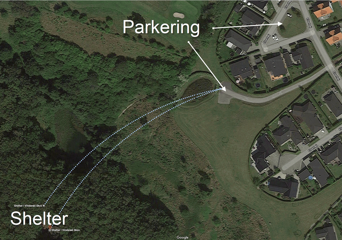Parkering kan foretages i villakvarteret nordøst for shelterpladsen.